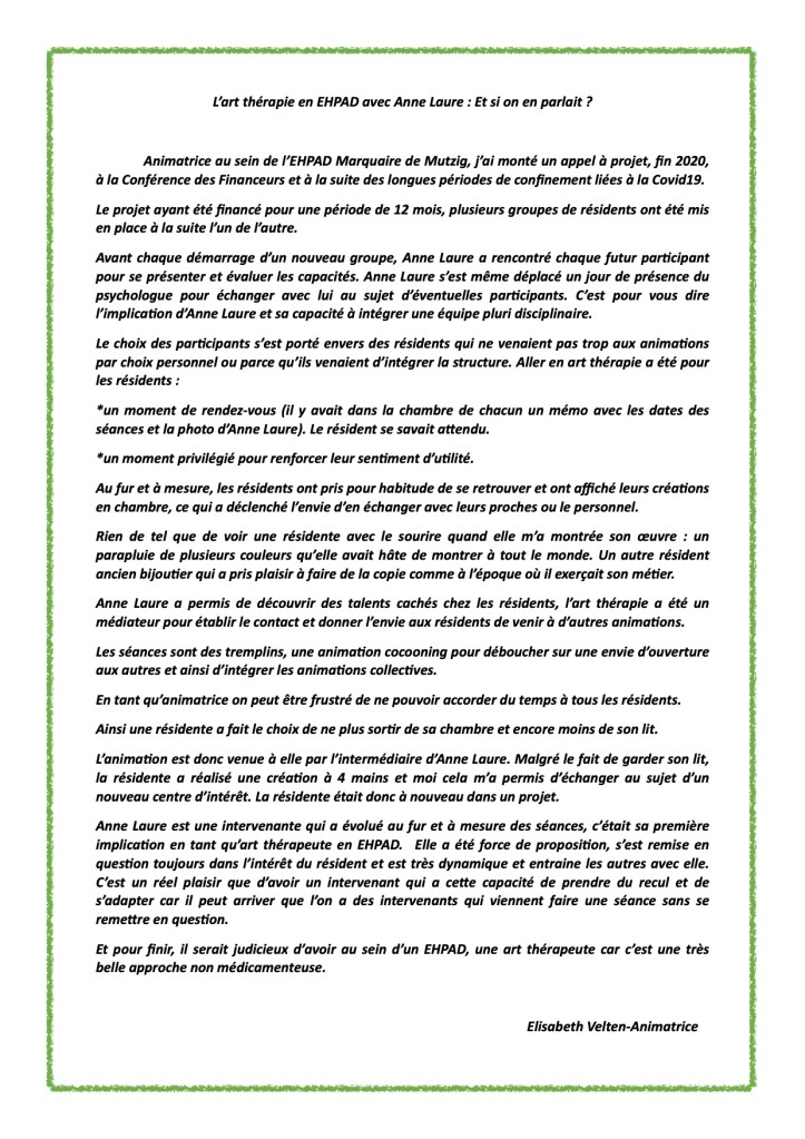 Une très belle expérience qui m’a fait touché du doigts tous les bienfaits que l’art-thérapie procure aux résidents. Des rencontres humaines, de la chaleur, de la couleur et l’envie de développer davantage ces interventions !